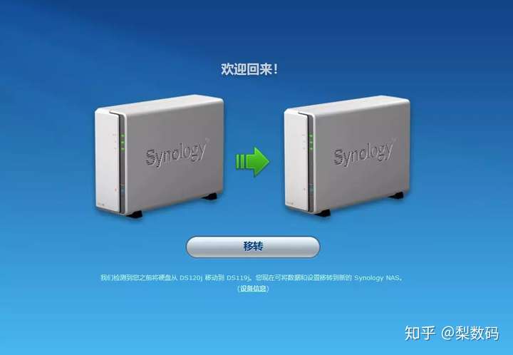 重启之后一般来说设备名称又会改变了,去路由器界面里查看一下新的 IP,然后浏览器打开页面就能看到群晖的转移提示了: