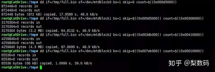dd if=/tmp/full.bin of=/dev/mtdblock3 bs=1 skip=$((0x007eb000)) count=$((0x00010000))执行结果如图: